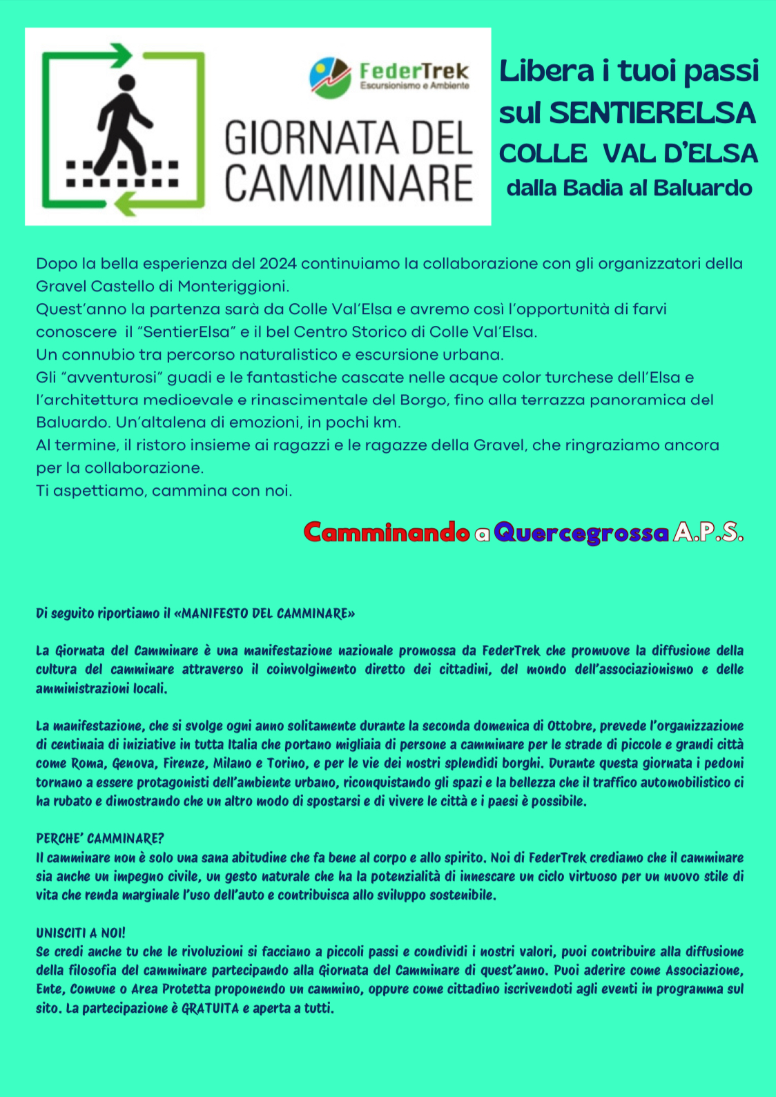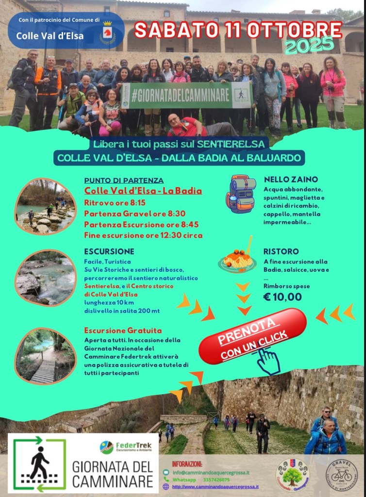 Sabato, in occasione della Gravel Castello di Monteriggioni, l’associazione Camminando a Quercegrossa organizza un Trekking facile e aperto a tutti verso il Sentierelsa e il centro storico di Colle di Val d’Elsa.Al rientro ristoro finale insieme ai ciclisti per condividere lo spirito della giornata.